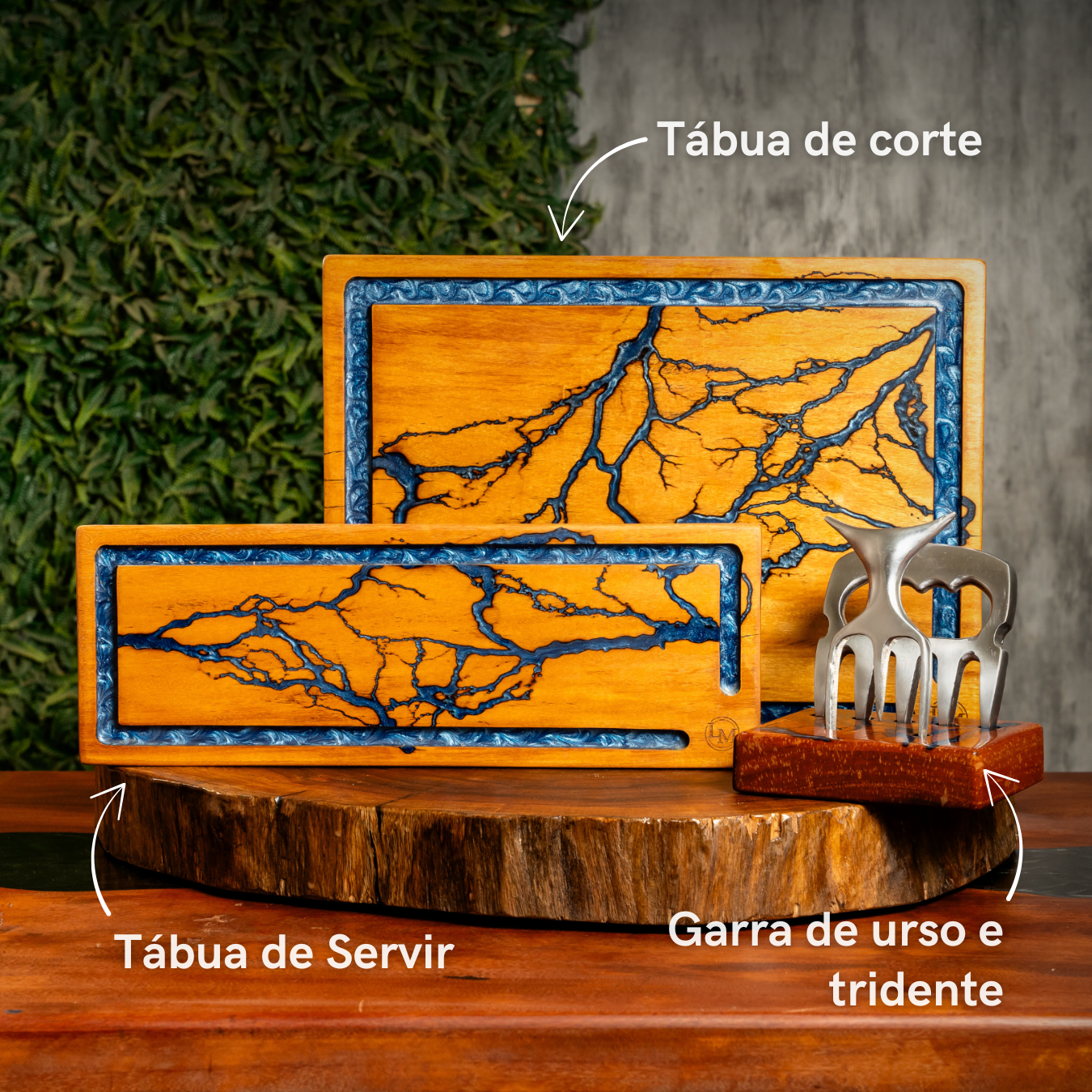 Uma tábua de corte robusta, uma tábua para servir, além de um tridente e uma garra de urso para manipular carnes com praticidade e estilo.