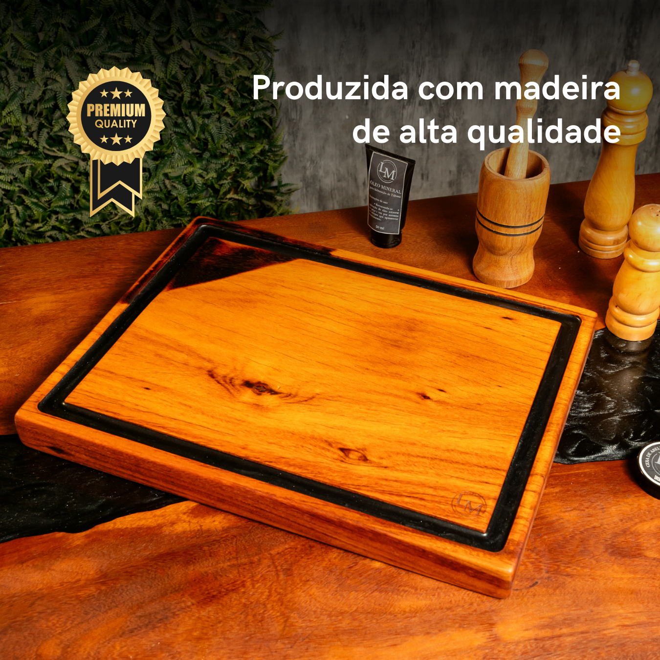 É simples: lave com água e sabão neutro, seque bem e passe óleo mineral de vez em quando. Isso mantém a madeira hidratada, bonita e pronta pra aguentar qualquer corte.