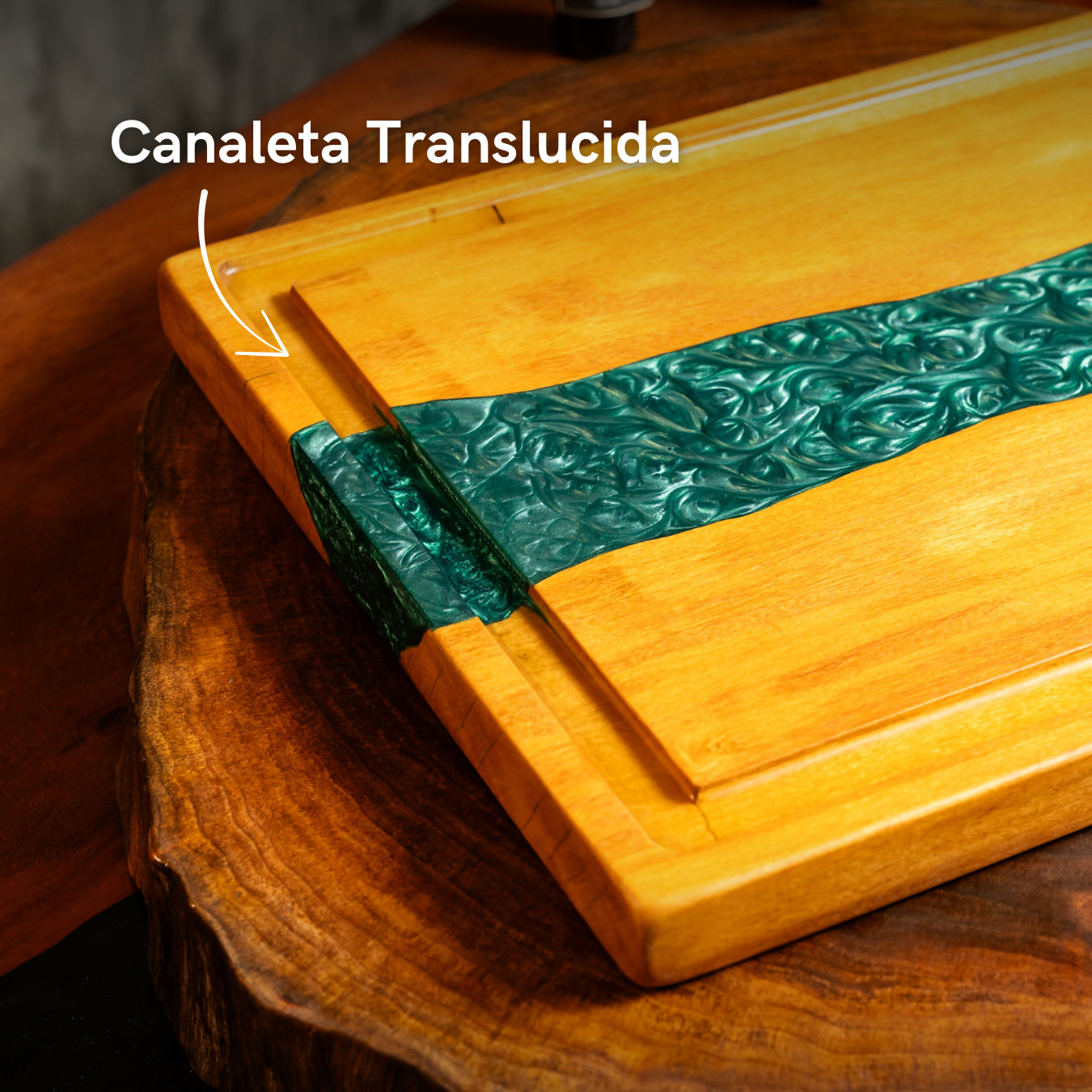 A Tábua River é mais do que uma superfície de corte, é uma jornada visual ao longo de um rio de resina colorida que une duas partes de madeira.